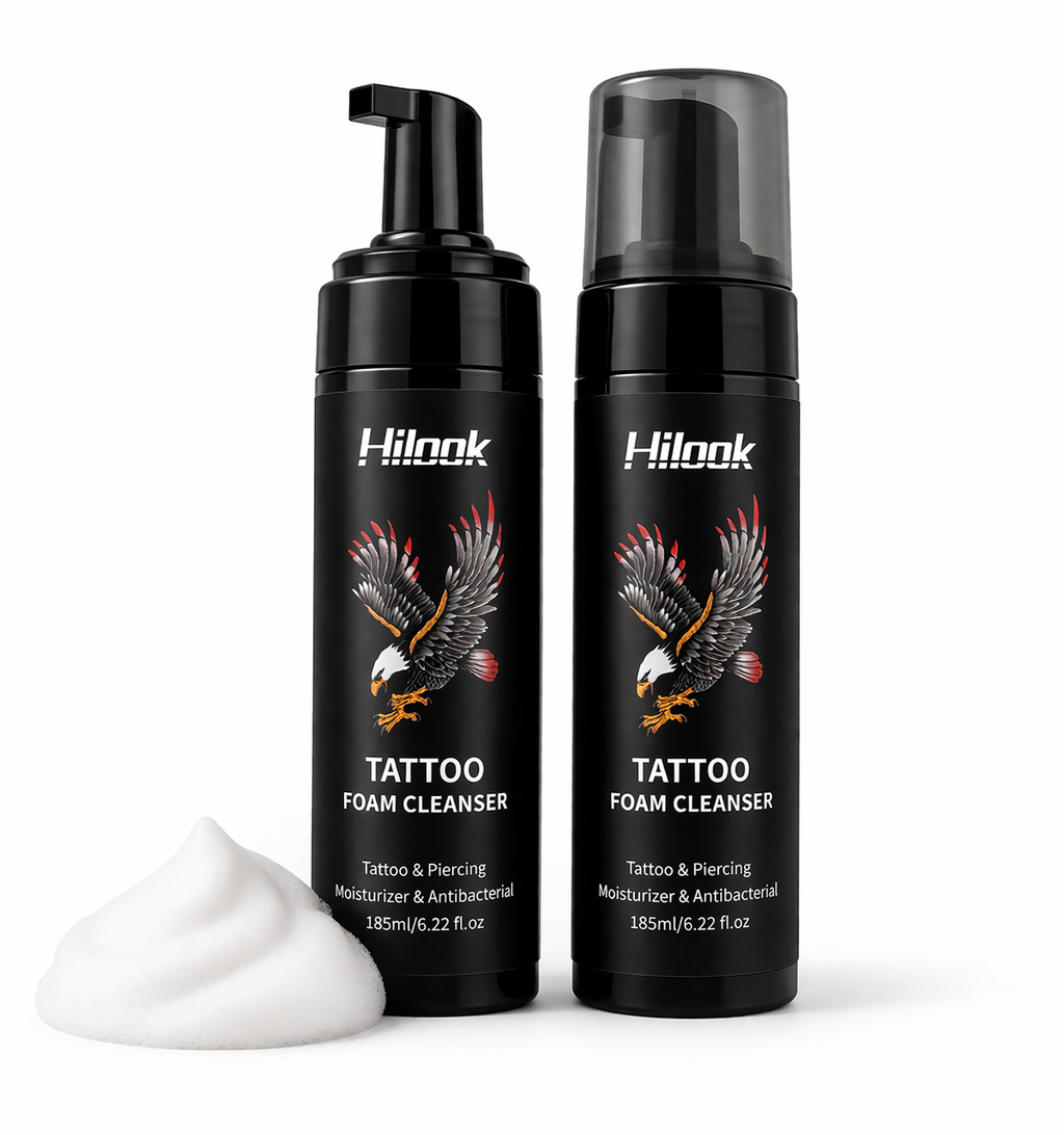 The Hilook Tattoo Foam Cleanser is an antimicrobial soap and skin cleanser designed to gently clean and protect fresh tattoos and piercings. Its foaming formula helps prevent infection, reduce irritation, and maintain the vibrancy of your ink with daily use.