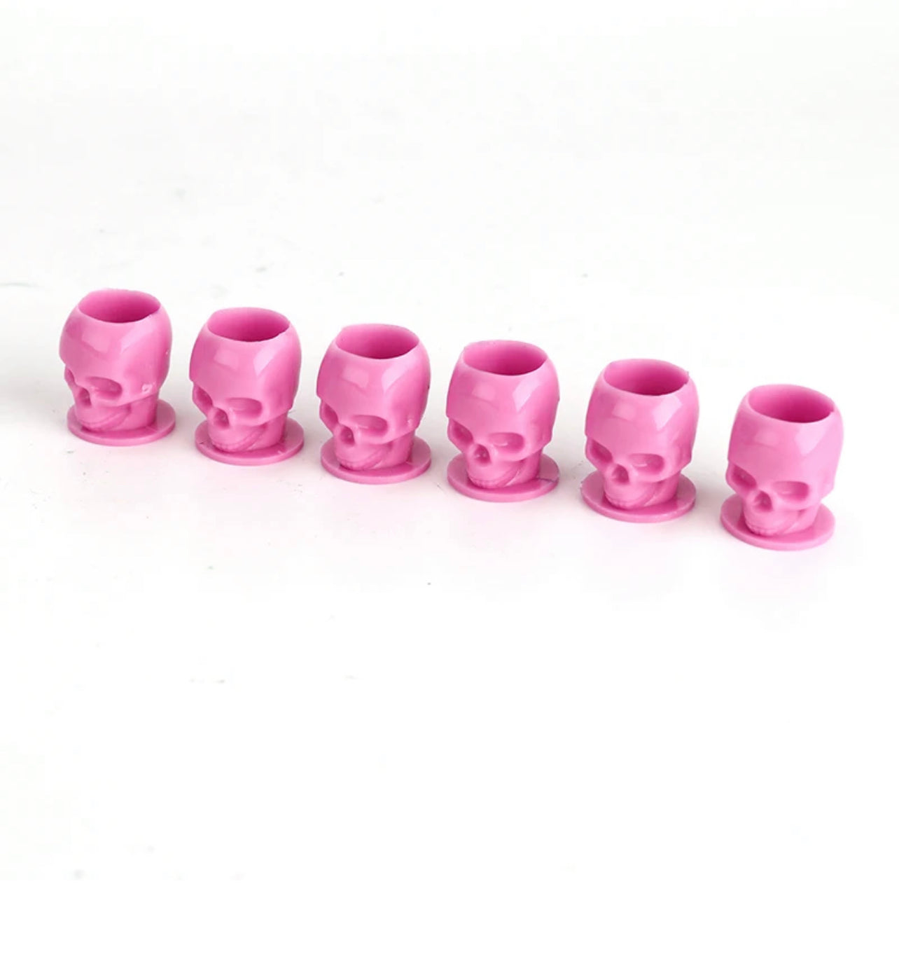 Tackle your next tattoo with these adorable skull ink cups. These ink caps are size 16mm and can store a large amount of tattoo ink, anaesthetic, pigment seal, etc for your next session. Available in your choice of pink, or white.